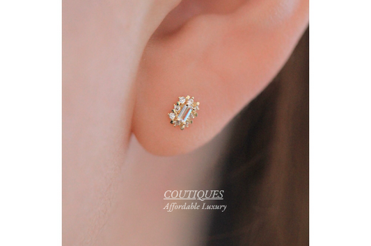 A Pair | 9K Solid Gold Dainty Flower studs, Elegant Baguette Gem Stud Earrings, Cubic Zirconia Earrings, Tiny Delicate Stud, Real Gold Stud