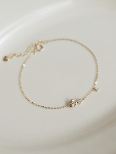 14K Solid Gold Dainty Zirconia Rose Love Heart Bracelet Chain, Real Gold Delicate Rose Floral Bracelet, Minimalism Gold Chain, Gift For Her
